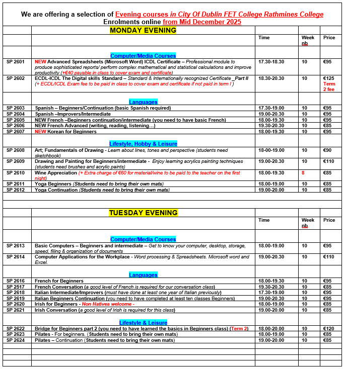 | SP 2613 | Basic Computers – Beginners and Intermediate | Tuesday | 18.00-19.00 | 10 | €95 |